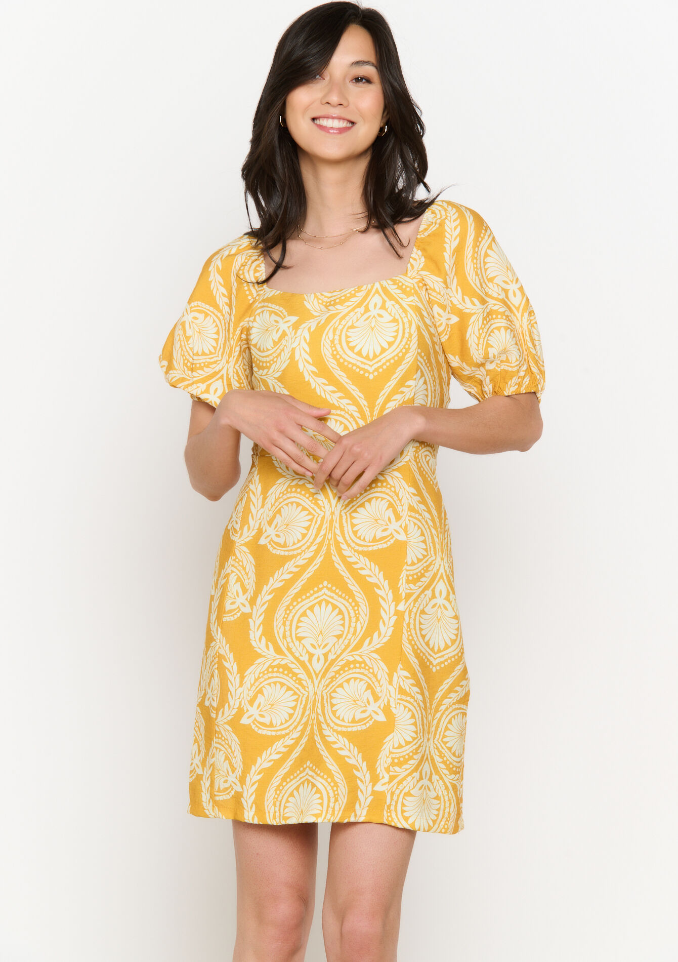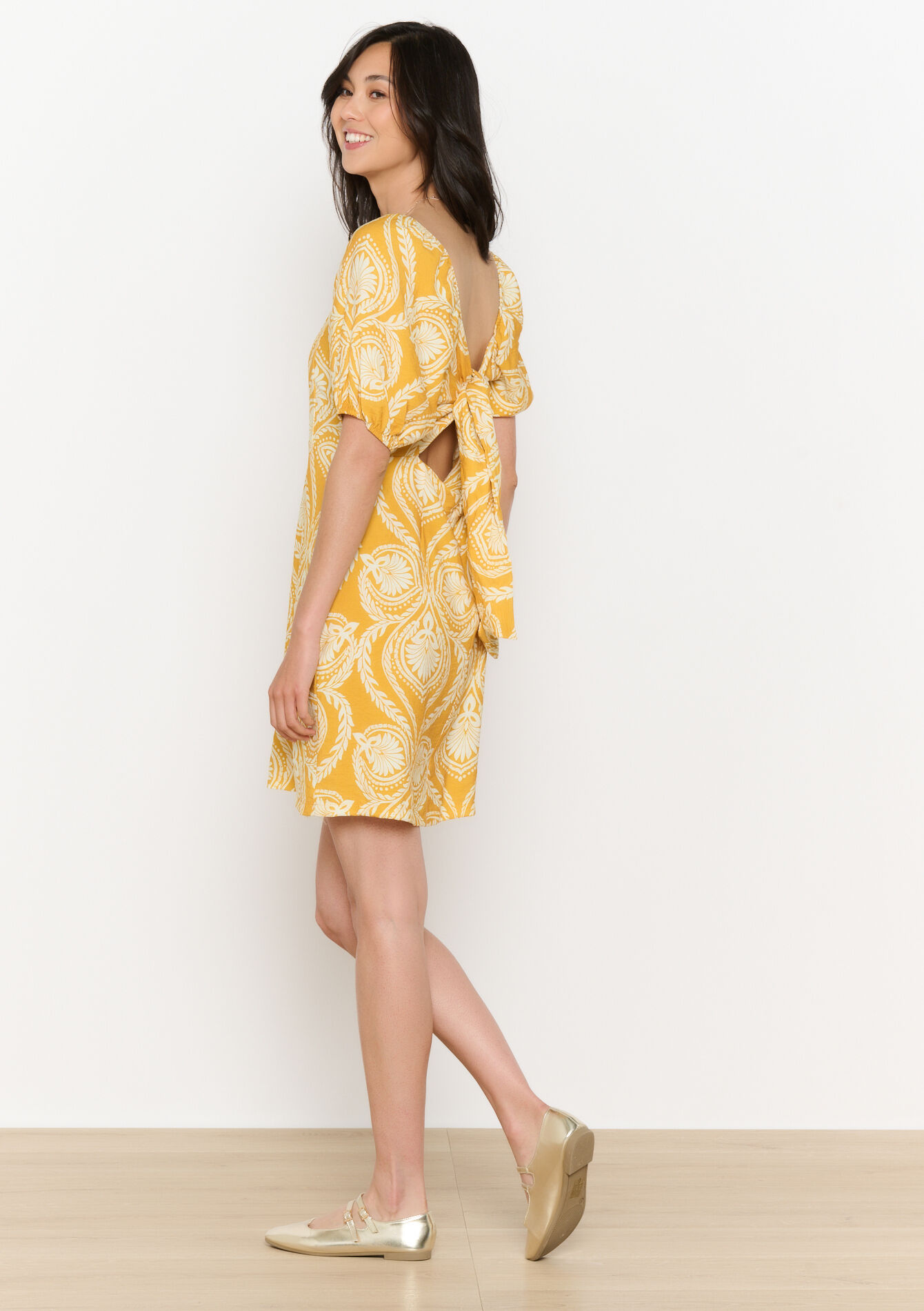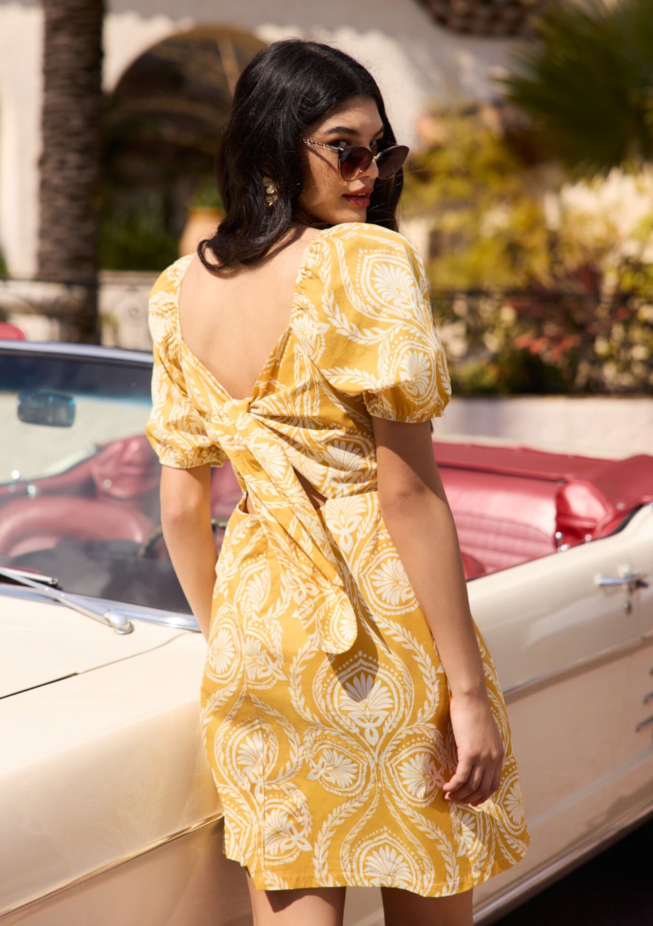 Short dress with a statement back bow and puff sleeves. Its ornate print brings vibrant flair to sunny days.