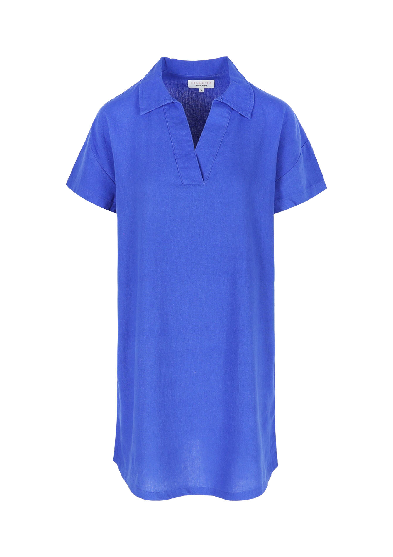 Een lichte linnen hemdjurk met open kraag. Chic en moeiteloos voor de zomer.