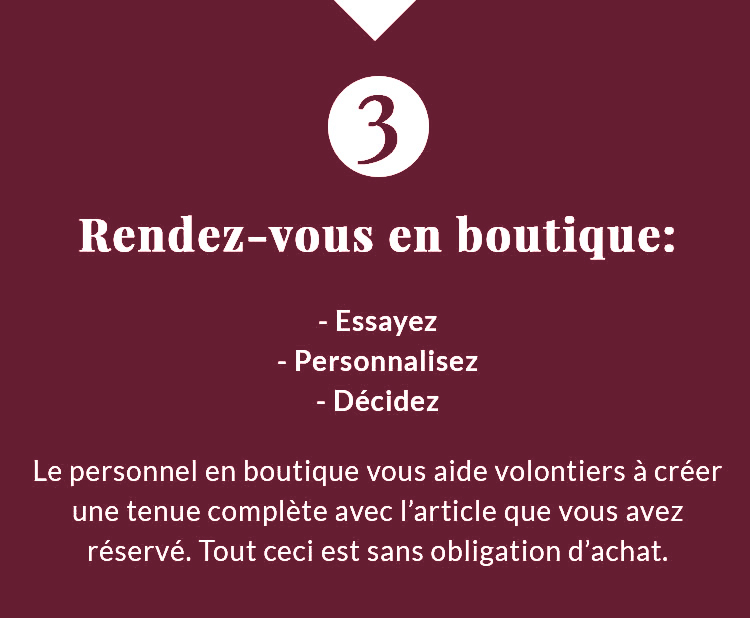 Le personnel en boutique vous aide volontiers à créer une tenue complète avec l’article que vous avez réservé. Tout ceci est sans obligation d’achat.
